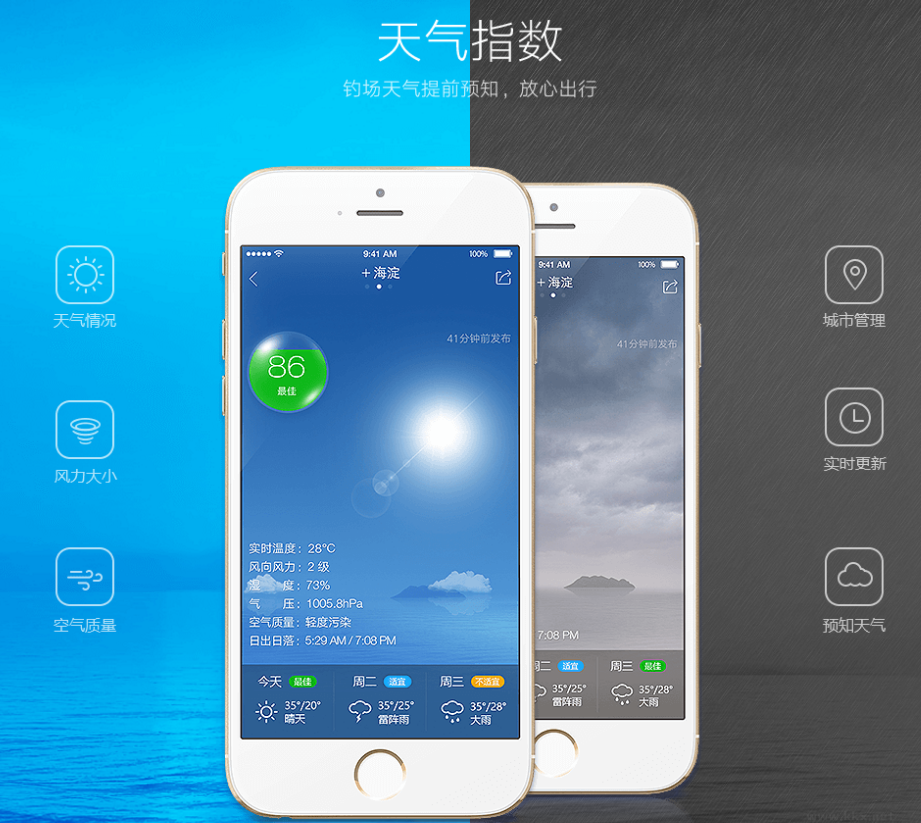 3、查天气: 查全国各城市天气预报,根据钓鱼所需的温度、气压、风力等天气参数,综合计算钓鱼指数,为你提供出钓参考,形象直观;