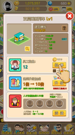 招募员工是快速提升赚钱速度方式之一,只需要花费金币就可以提升赚钱速度,当然花费的金币数量也是逐渐递增的。升级建筑等级则能提供吸引人的倍数加成,升级需要的建筑卡可以通过商战兑换或商店购买获得。
