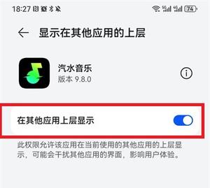 6、进入之后就可以看到【显示在其他应用的上层】点击打开按钮就可以实现桌面歌词。