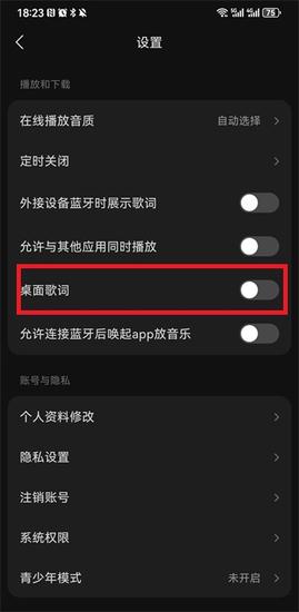 3、在设置功能之中,我们就可以看到【桌面歌词】点击打开按钮就可以开启桌面歌词显示;