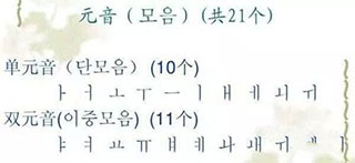 元音可以理解成韩语中的部首部分的位置。元音包括21个,10个单元音,11个双元音。