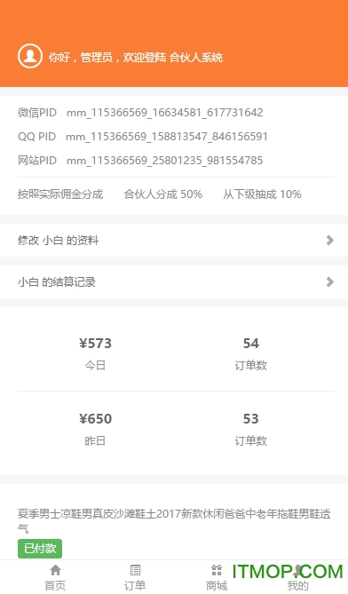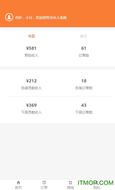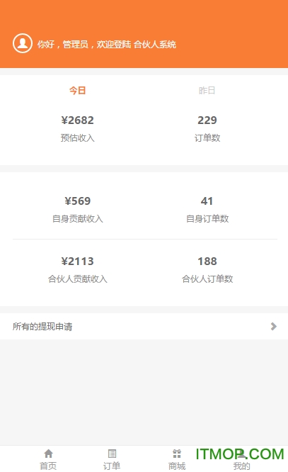 登录之后进入管理后台,可以查看今天和昨天 自己的收入以及代理的业绩