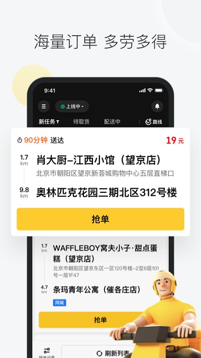 1、每日海量订单,随时开始送单赚钱