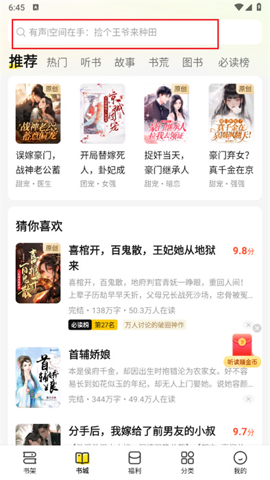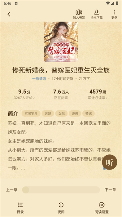 语音朗读功能提供多种声音任你选择,满足你的听书需求,解放双眼,随时随地听小说,海量小说免费听!