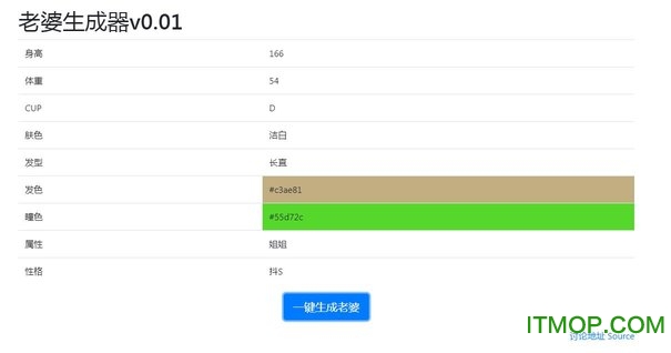 打发时间的小游戏,可以随机生成自己老婆的各种属性,性格、肤色、身高、体重、CUP、发型、发色、瞳色等等,操作简单一键生成,我先统计一下各位想要的型号,到时候一键发货,希望各位喜欢!哈哈哈!