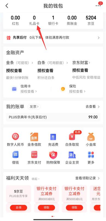3、打开我的钱包后,在上方的功能列表中选择【礼品卡】;