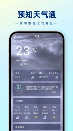 《预知天气通最新版v1.0.0安卓版》是一款手机日常天气预报查询的服务软件,能够快速查询各个地区的天气预报,有24小时7天15天的详细天气情况,全面的天气,信息丰富的天气动画,没有任何的广告干扰,帮助用户轻松查询每天的天气情况,有大风大雨的恶劣天气能够提前预警,让大家能够做到各种应对的准备,能够准确的查看温度,湿度,气压,风向风速等详细数据,方便大家提前做好规划,给用户的生活出行提供最方便的服务,让大家第一时间了解常用城市和所在地的所有天气情况。