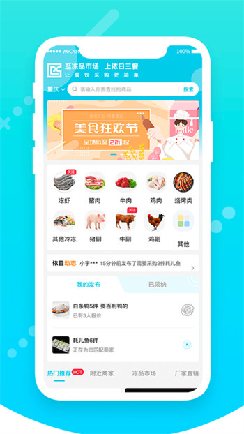 依日三餐是一款针对餐饮门店打造出来的餐饮采购软件,包含的食材种类可是非常的丰富,不管是鸡鸭鱼肉还是烧烤虾蟹,都可以给用户提供,满足了你的所有采购需求,把更多的品质供应商家全部都汇聚在平台当中,随时都可以发布自己的采购,和商家进行在线报价进行沟通,有着更加方便的交易。