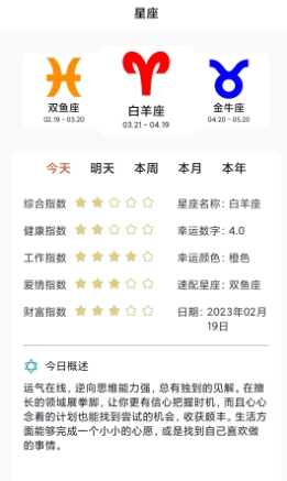 1, 了解掌握各个星座,包括双鱼座,白羊座,金牛座具体的日历分配,确定属于哪一座星,对今天,明天本周本月本年运势进行分析综合指数,健康工作,爱情财富指数推荐。