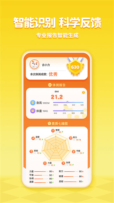 一套专为儿童量身设计的体适能体系,从耐力、灵敏、力量、速度、协调、平衡、柔韧七大维度出发,全方位锻炼孩子的身体,记录孩子的每一次成长。