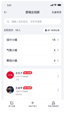 4, 管理员可以在部门设置里面添加新的子部门,设置新的公司架构,邀请添加新的成员,管理入职,离职的成员,方便快捷,高效实用。