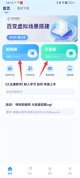 1、首先下载安装好易创相机APP,点击进入软件,首页主要是就那些拍视频开直播,提供各种虚拟场景的搭建,点击”我的作品“即可查看自己发布的所有视频;