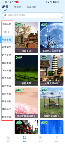 2、点击素材栏目,给大家提供的超多丰富的素材,并且进行细致分类,各种电商展示、户外场景、旅游场景等等,根据需求进行选择下载;