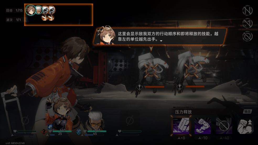 4、在左上方可以看到双方的行动,能看到敌我双方的行动顺序和即将释放的技能,越靠左的单位越先出手;