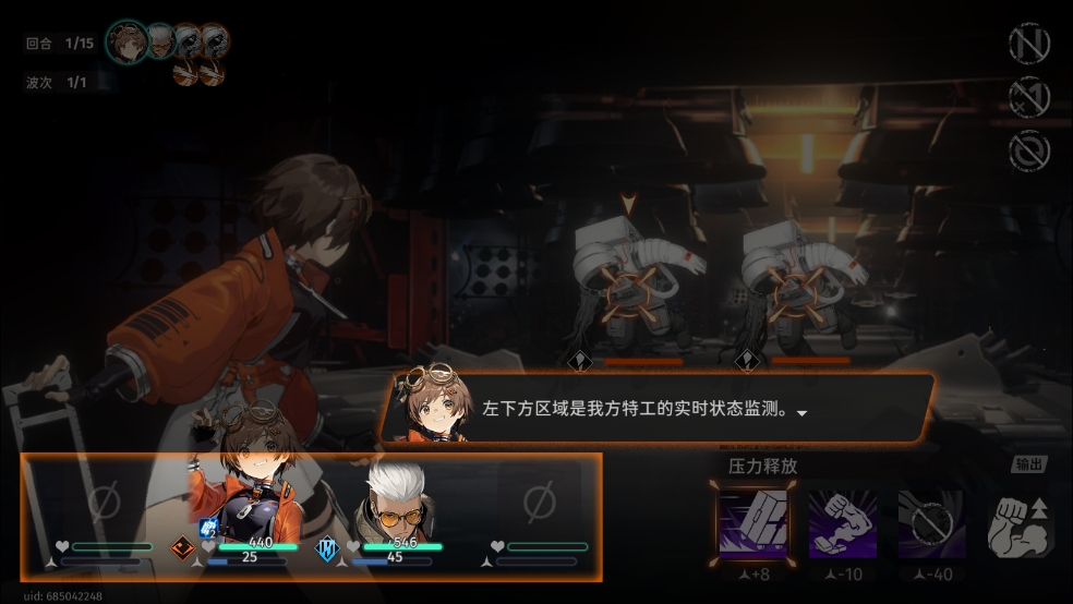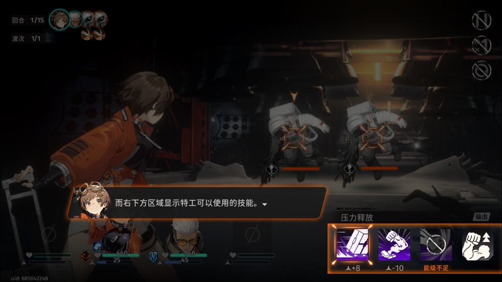 2、战斗界面的右下方将会看到特工的技能,可使用的技能会呈现亮着的状态进行攻击;