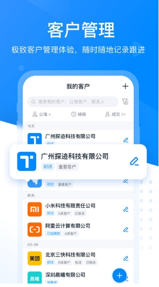 探迹crm系统是一款便捷好用的营销辅助工具。客户端当中汇聚了来自各行各业的优秀企业数据,可更好地帮助营销人员提高自己的从业业绩。另外,能够挖掘到更多的优质客户,不断提升用户的销售水平和销售技巧,将人工智能和大数据进行结合以及实现了用户移动办公的需求。