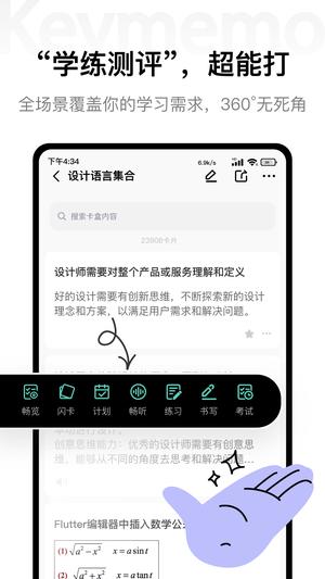 keymemo提供了闪卡、畅览、畅听、测试、书写、考试、计划7个学习模式。用户可根据自己的习惯和内容的掌握情况,选择不同的学习模式,打通学练测评各个环节。