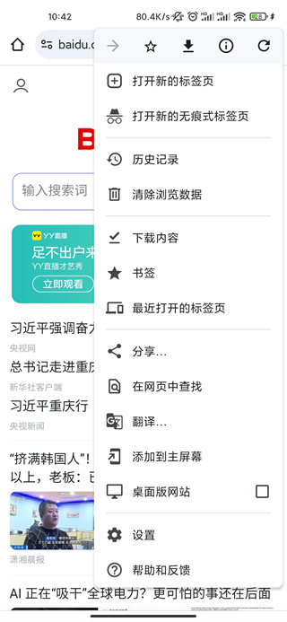 4、通过打开的设置栏可以打开新的标签页、打开无痕模式标签页、浏览历史记录、清除浏览数据、访问下载内容等。