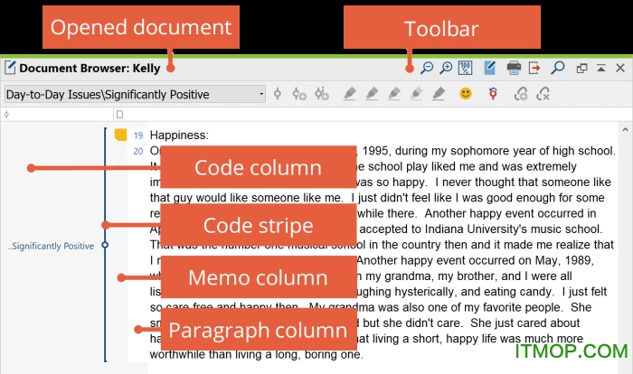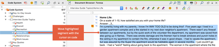 无论哪种编码方法最适合您,在分配新代码后,您将在“文档浏览器”窗口的左侧看到所选颜色的编码条纹。要更改此代码的范围,请再次选择所需区域,右键单击编码条带,然后选择“使用突出显示的段重新编码”。