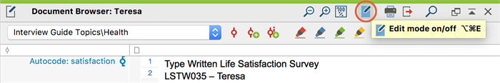 默认情况下,MAXQDA将以允许您编码但不编辑它们的方式打开文档。要编辑文本或表格文档的内容和格式,首先必须在窗口的工具栏中激活“编辑模式”。