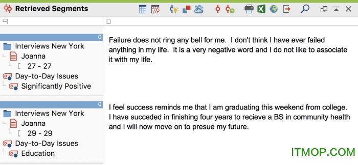 显示编码数据 - 在“ 检索的段”窗口中搜索并显示某些“编码段”(例如,在文档X,Y和Z中分配了代码A,B和C的所有数据选择)。