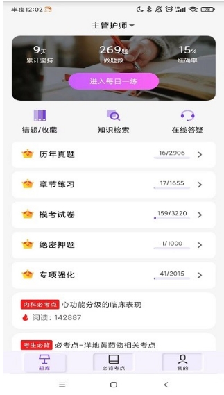 护理智库是可以学习护理方面知识的软件。其中拥有众多的学习资源,用户在这里不断的练习刷题会提升自己的做题效率,能够提升自己的学习成绩。软件为广大用户提供了便捷的使用功能,快速的寻找感兴趣的一切知识,拥有大量真题在线测试,更快的掌握知识。关于护理方面考试免费题库,其中包含章节练习,每日一练,历年真题,模拟试卷等海量真题,全部都能免费去学习。便捷式的做题方式,带来更优质的学习过程。