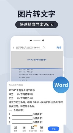 扫描君免费版是一款拍照识别软件,能够扫描文档图片和表格,精准提取其中的文字,将所有信息转换成文字,会提高工作效率,实现智能识别和手写识别文件扫描等方式,有着十分丰富的功能,也可以对其进行格式转换,无论是转换任何格式都是比较方便的,能导出成为其他的格式,比如图片或PDF和word等,是十分好用的移动式扫描仪,在短时间之内会将各种文字编辑成为自己需要的内容,提高效率。