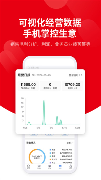 1老板不用出门,在家就可以轻松了解利润报告前或日清经营情况,实时播报,多维度销售统计排行,一目了然,心中有数。
