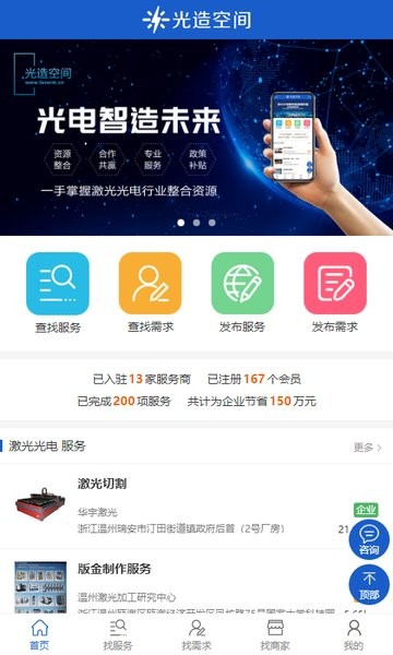 光造空间手机版可以帮助企业更好的去寻找合作的厂家,整体的软件界面都是清新简约的使用起来非常的方便快捷,可以迅速的找到自己需要的功能,查找需求、发布需求都是可以的。