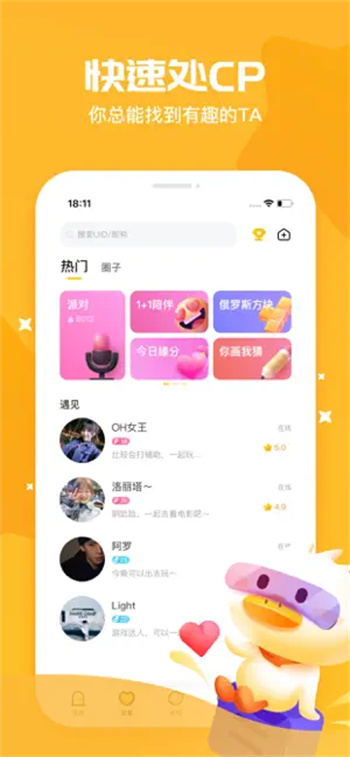 冲鸭是一款游戏派对交友的软件,通过软件可以找到与自己喜欢同一个游戏的人,分享彼此游戏的体验,无论是峡谷召唤师还是桌游爱好者,总有志同道合的人陪伴自己分享游戏当中的快乐,了解最新的游戏动态,增加几率认识同样喜欢游戏的另一半,随时的在线与对方进行聊天交流,说不定缘分就在这里,更多精彩的游戏等待着用户的参与。
