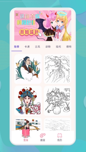 在自由涂色里面有着各种不同风格的图案,有卡通古风动物,现代包括植物等等。