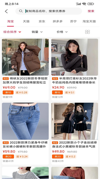 3, 输入商品名称,搜索更多优惠券,可按照综合排序查询所中意的商品,有各大电商积极推荐,如,淘宝,天猫,京东,拼多多,苏宁,海宝,天猫等。