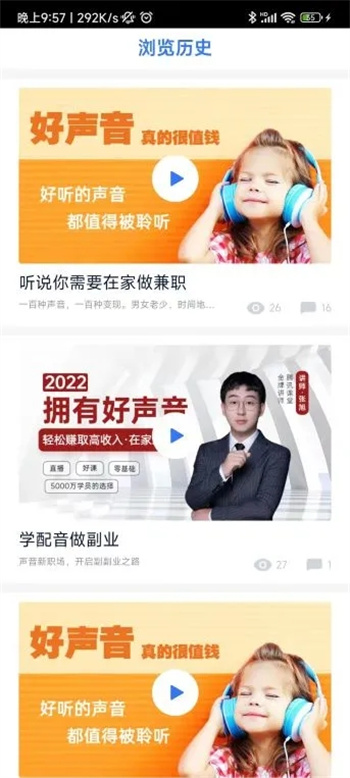 职享学配音兼职赚钱是一款学习配音赚取收益的软件,提供专业的播音主持学习,掌握其中的技巧,开始兼职赚取收益,各种不同的配音项目都可以自己选择,完成对应的项目获得报酬,每天都可以赚取收益,增加个人的收入。