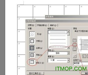 5、在”边框“选项选择”自定义“,然后在右侧有一个中间横线,可以把中间横线改成虚线。以此方法把3、4行,5、6行,7、8行,9、10行的中间横线改成虚线。