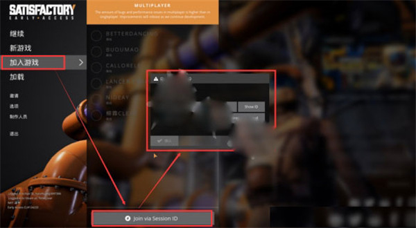 要联机的好友在游戏主菜单中,选择加入游戏->join via Session ID,然后将房主发给你的一串信息粘贴到对话框里,确定即可。