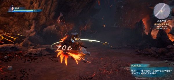 开始操作角色,首先是最简单的移动、调整视角、跳跃、加速跳跃、闪避等等。接下来会看到一只拦路的迦楼罗魔,它就是新手的战斗教程。进行普通攻击、跳跃攻击的学习后,击杀它就能继续前进了。